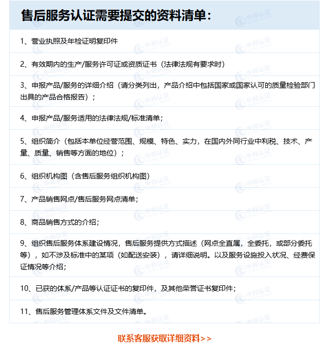 商品售后服务认证又称GB/T27922商品售后服务评价体系,可证明企业在全行业的服务领先性。表明其已获得消费者和市场认可。企业在产品及包装上使用服务认证星级标志,具有说服力和证实性,以便让消费者可以放心选购,同时也为大型项目招标、政府采购招标等方面提供资质证明。商品售后服务评价体系认证的核心内容是“评价指标”和“评价方法”两部分。“评价指标”部分主要是规定了用于商品售后服务评价的指标及其含义,具体分为三大类:针对售后服务体系的评价指标、针对商品服务的评价指标和针对顾客服务的评价指标。其中,针对售后服务体系的指标,强调企业在售后服务的组织、管理、资源等基础条件方面所做出的努力;针对商品服务的指标,强调对企业在围绕“商品”所开展的有关服务活动和服务行为的规范;针对顾客服务的指标,强调对企业在与顾客的交往过程中,应注重的服务问题和服务行为的规定。“评价方法”部分主要是规定了在售后服务评价活动执行过程中的基本程序和如何评分、如何计算评分值等问题。